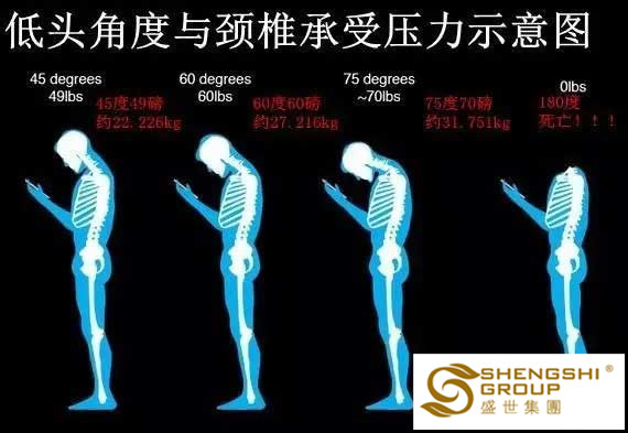 據報道,歐洲脊柱協會聲明中稱,一個人的頭部重約5kg,當前傾看手機等電子設備時,通常呈60°角,那么這時由于物理杠桿作用以及重力作用,一個人頸部肌肉就要承受25kg以上的重量。